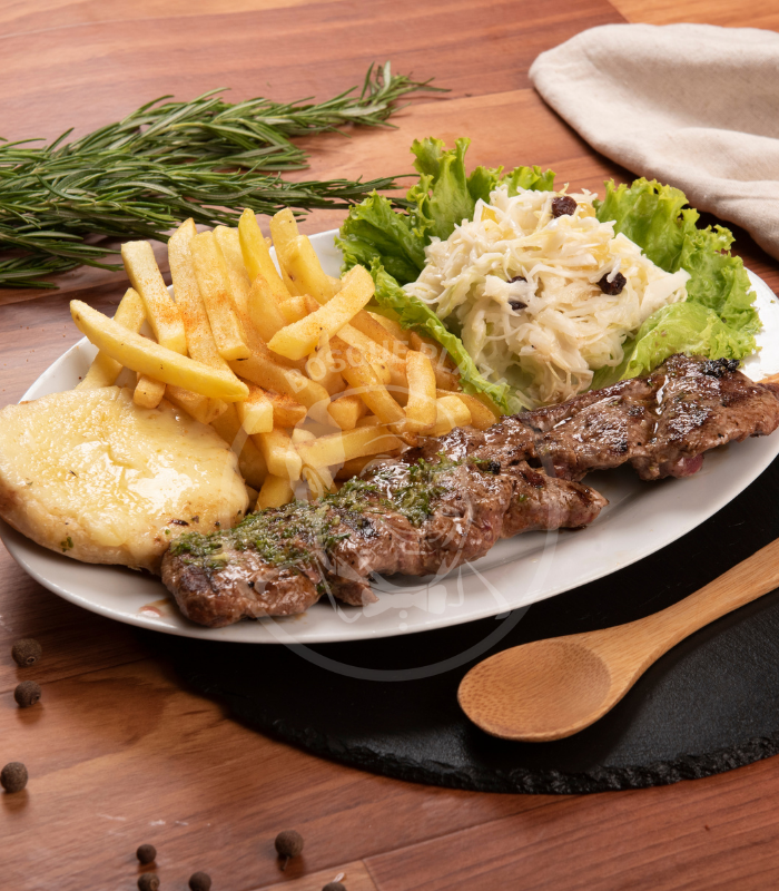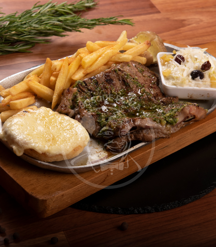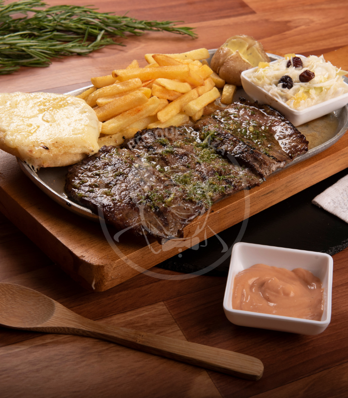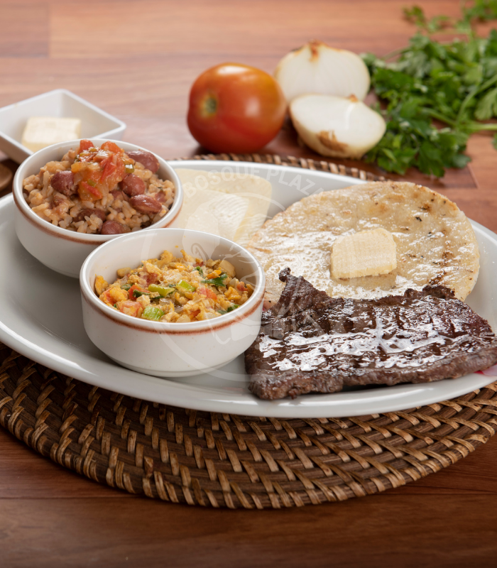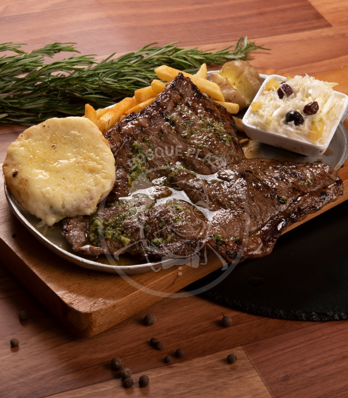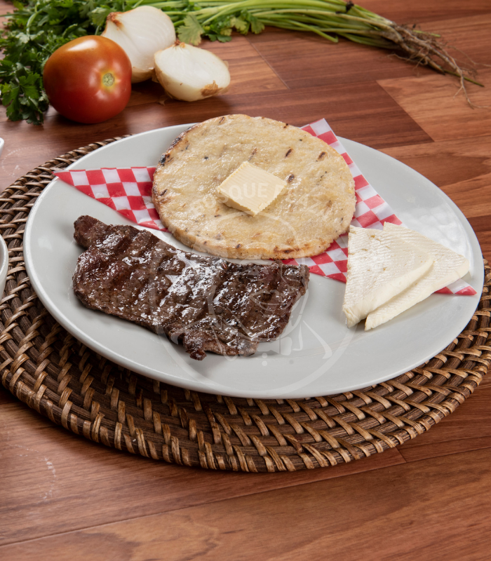 300 g de Carne, acompañado de papa al vapor o papa francesa, arepa, queso mozzarella y ensalada dulce.