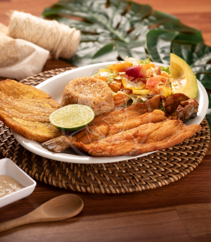 Acompañado de arroz con coco o arroz blanco, patacón, aguacate y ensalada verde de la casa.