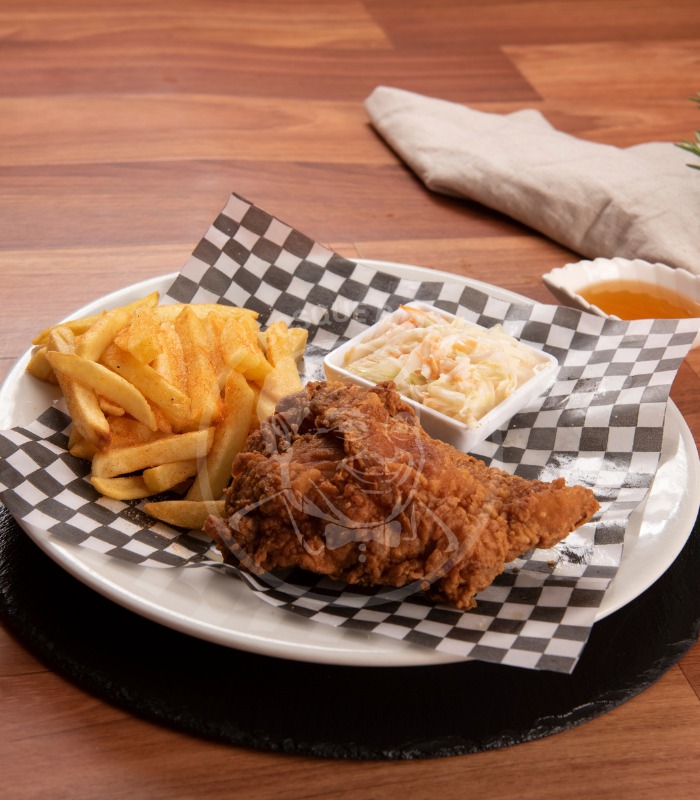 Muslo apanado, ensalada, papas a la francesa, gaseosa 10onz