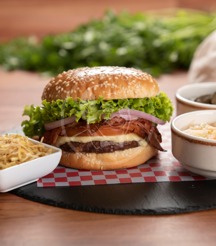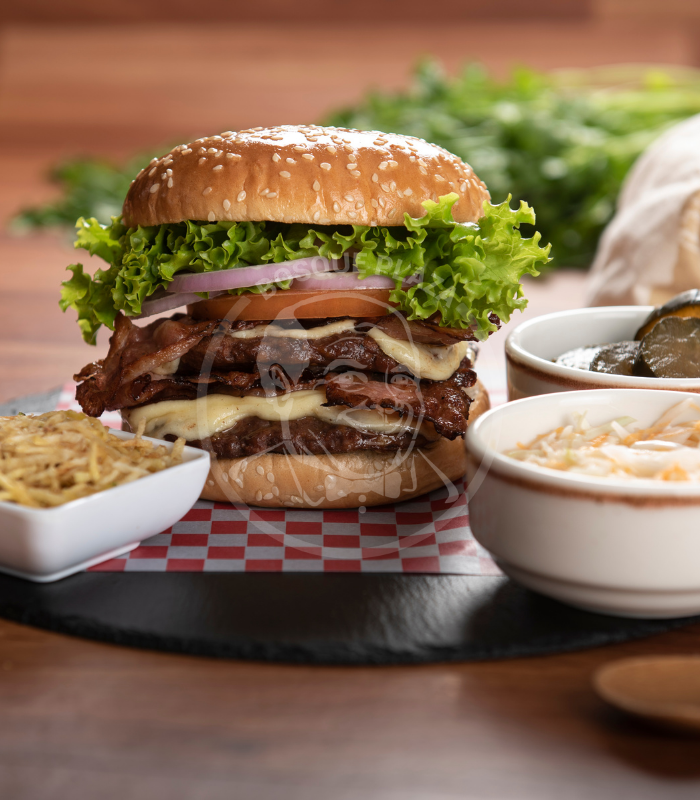 Hamburguesa súper (pan, 2 carnes, 2 mozzarella, 2 porciones de tocineta, lechuga crespa y tomate).