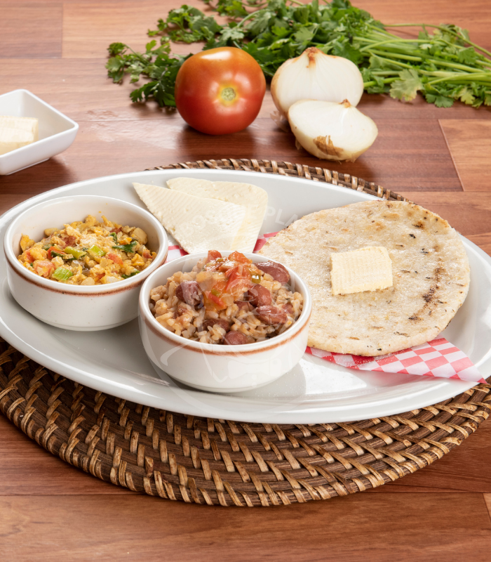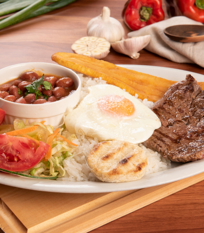 Frijoles, arroz, ensalada, arepa, maduro, 1 carne, aguacate y huevo.