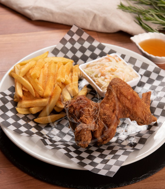Ala apanada, ensalada, papas a la francesa, gaseosa 10onz