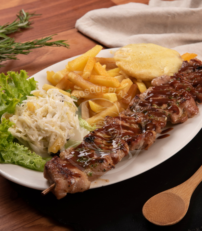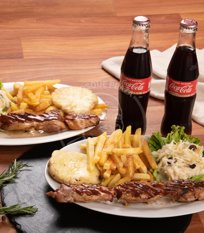 2 Chuzos de pollo con tocineta, papa, arepa, ensalada dulce y 2 gaseosas Coca-Cola de 250 ml.