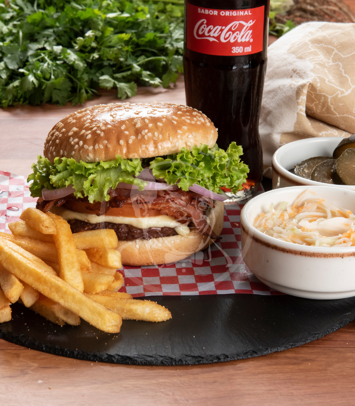 Pan, 1 carne, 1 mozzarella, 1 porción de tocineta, lechuga crespa, tomate, papas y gaseosa Coca-Cola de 350 ml.