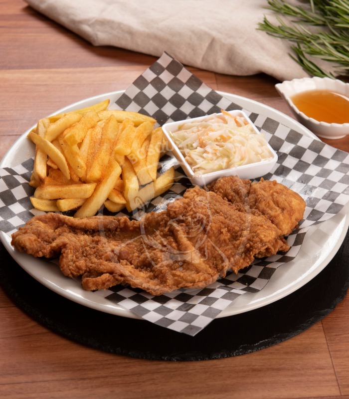 Pechuga apanada, ensalada, papas a la francesa, gaseosa 10onz