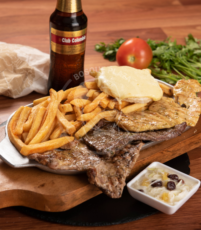 1 Carne de res, 1 carne de cerdo, 1 carne de pollo, papa al vapor o papa a la francesa, arepa, queso mozzarella y ensalada dulce.