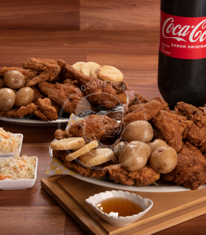 2 Pollos, 8 papas, 8 arepas, 2 ensaladas y una gaseosa Coca-Cola de 3 L.