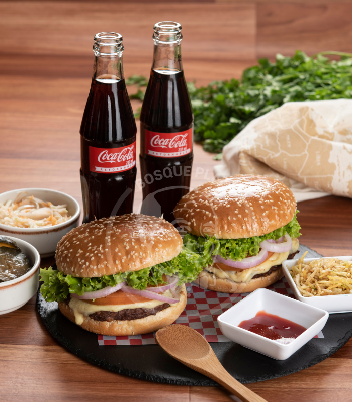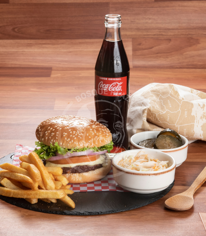 Pan, 1 carne, 1 mozzarella, lechuga crespa, tomate, papas a la francesa y gaseosa Coca-Cola de 350 ml.