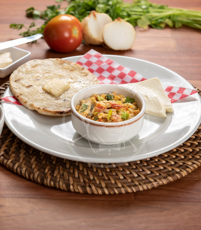 Arepa, quesito, huevo revueltos con o sin aliños, chocolate o café con leche o sin leche.