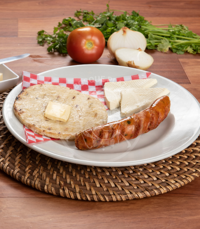 Arepa con chorizo: 1 chorizo, calentado, arepa, quesito, huevos revueltos, chocolate o café.