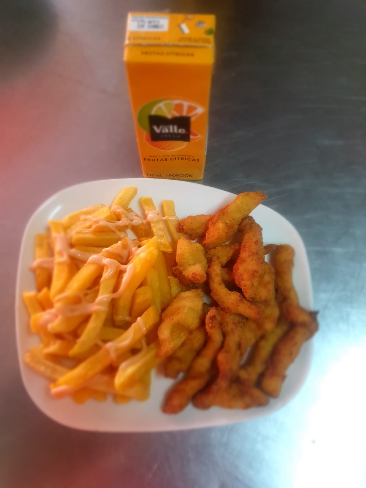 Exquisitas croquetas de pollo acompañadas de papas fritas y refrescante jugo del valle en cajita..