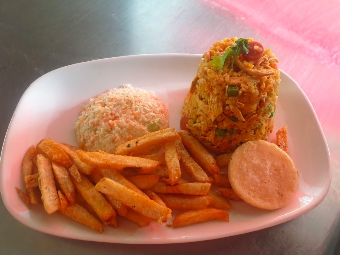 Salchicha, pollo, legumbres, acompañado de papa frita y ensalada agridulce de repollo