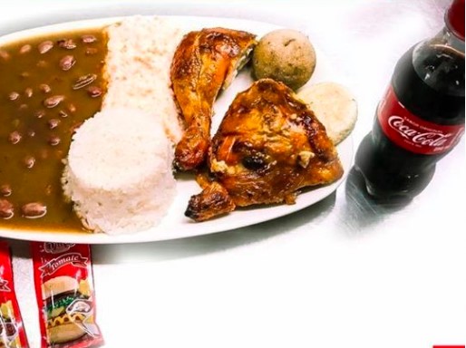 1/4. de pollo, arroz, fríjol, ensalada, arepa y bebida