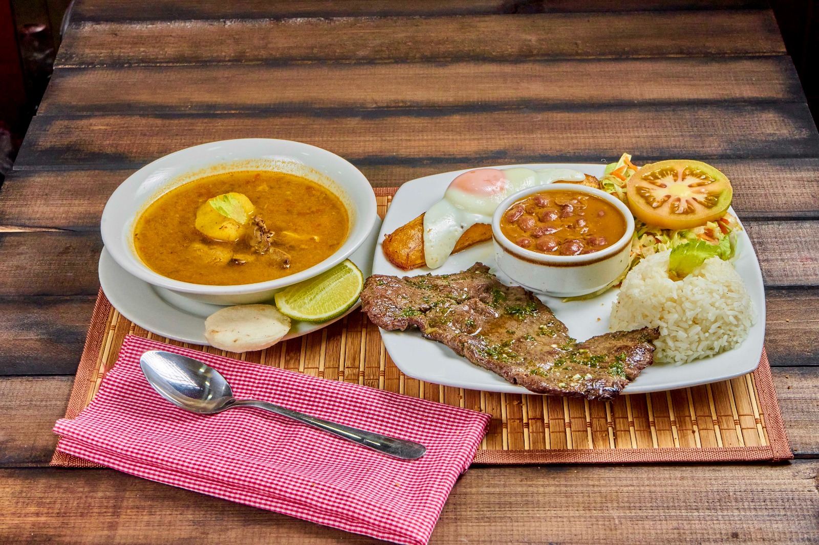 Arroz, frijoles, maduro, huevo, ensalada de la casa, sopa del día, jugo del día y carne de res.
