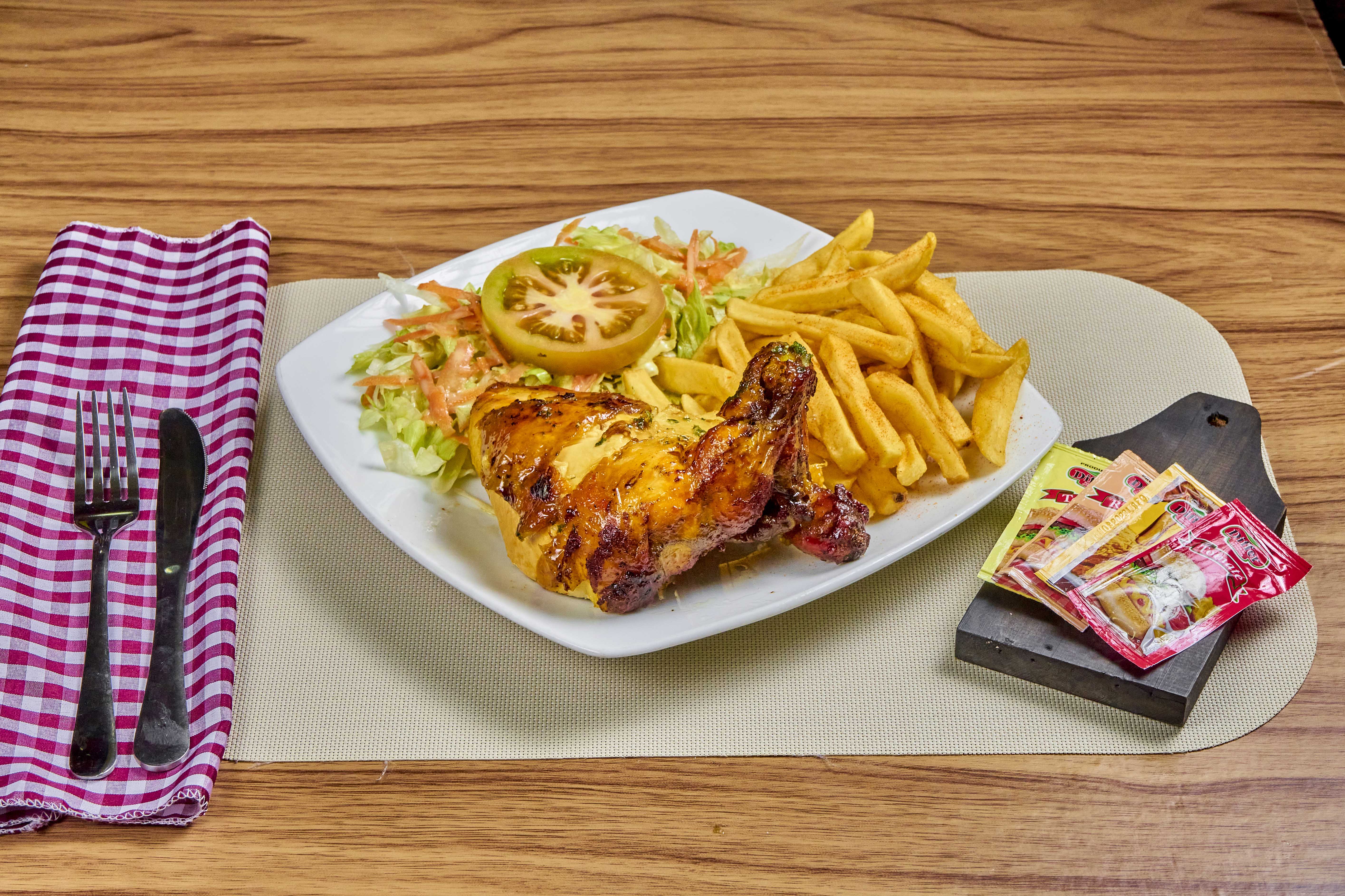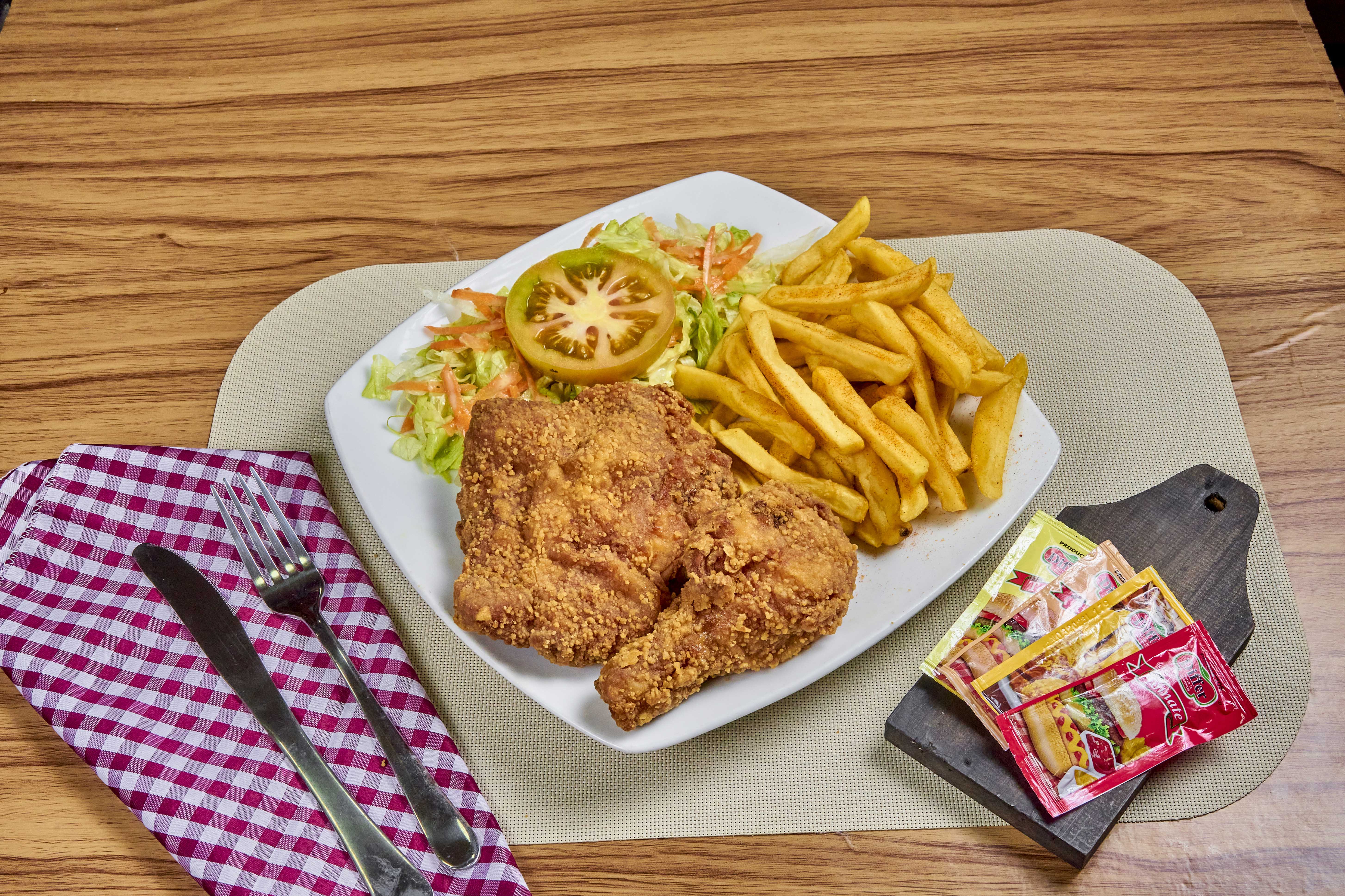 Dos presas de pollo muslo y contramuslo, acompañado de papas a la francesa y ensalada de la casa.