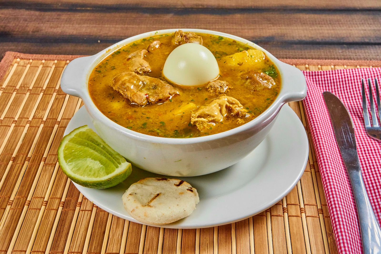 2 Presas de pollo acompañado de 1 arepa y 1 papa cocinada.