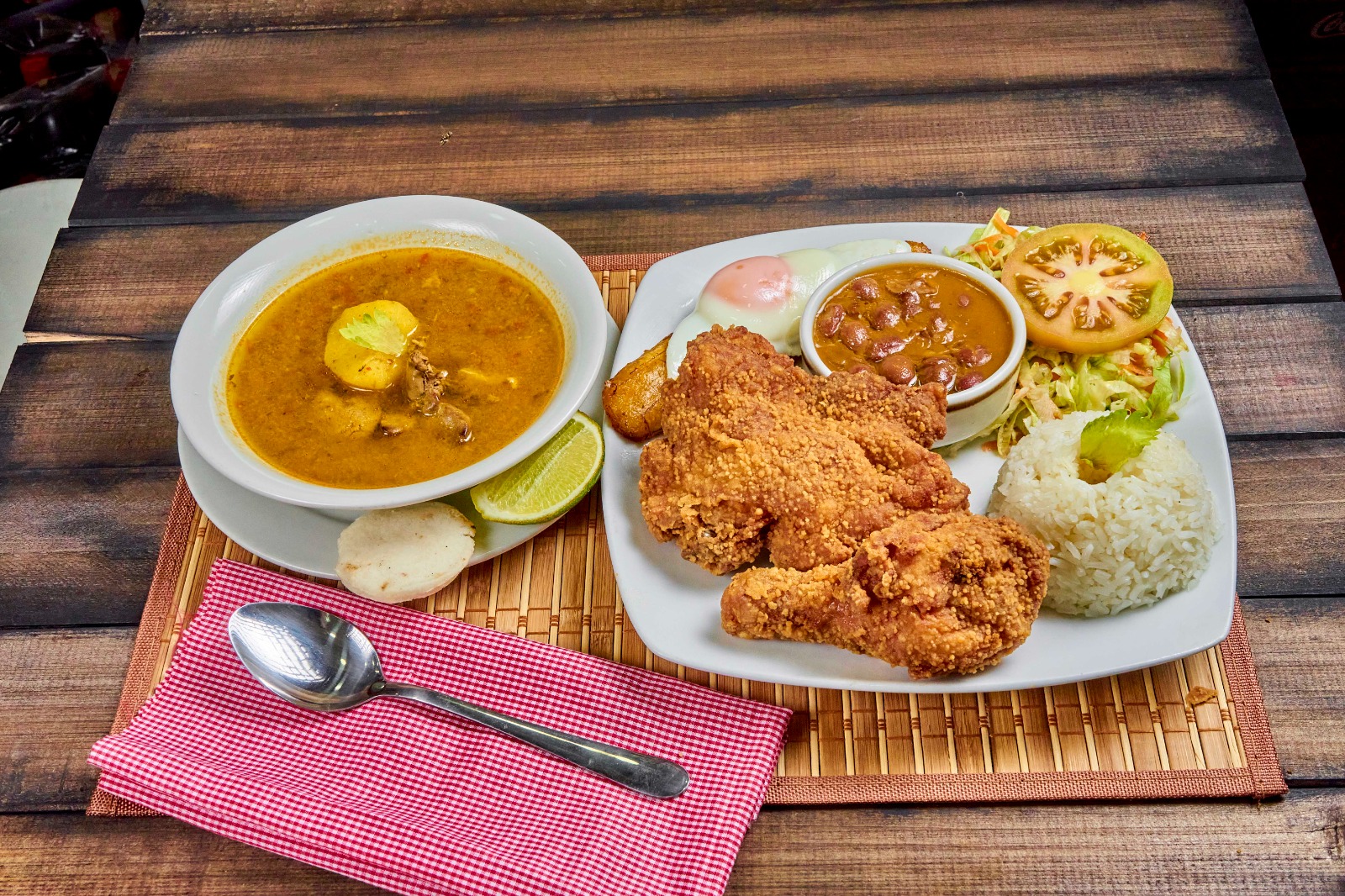Arroz, frijoles, maduro, huevo, ensalada de la casa, sopa del día, jugo del día y cuarto de pollo apanado.