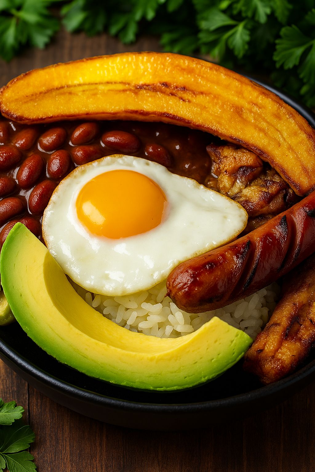 Platillo individual que incluye arroz blanco, fríjoles, una proteína a elección (una a elegir), chorizo, tajada de maduro, ensalada, rebanada de aguacate, una arepa y huevo frito.