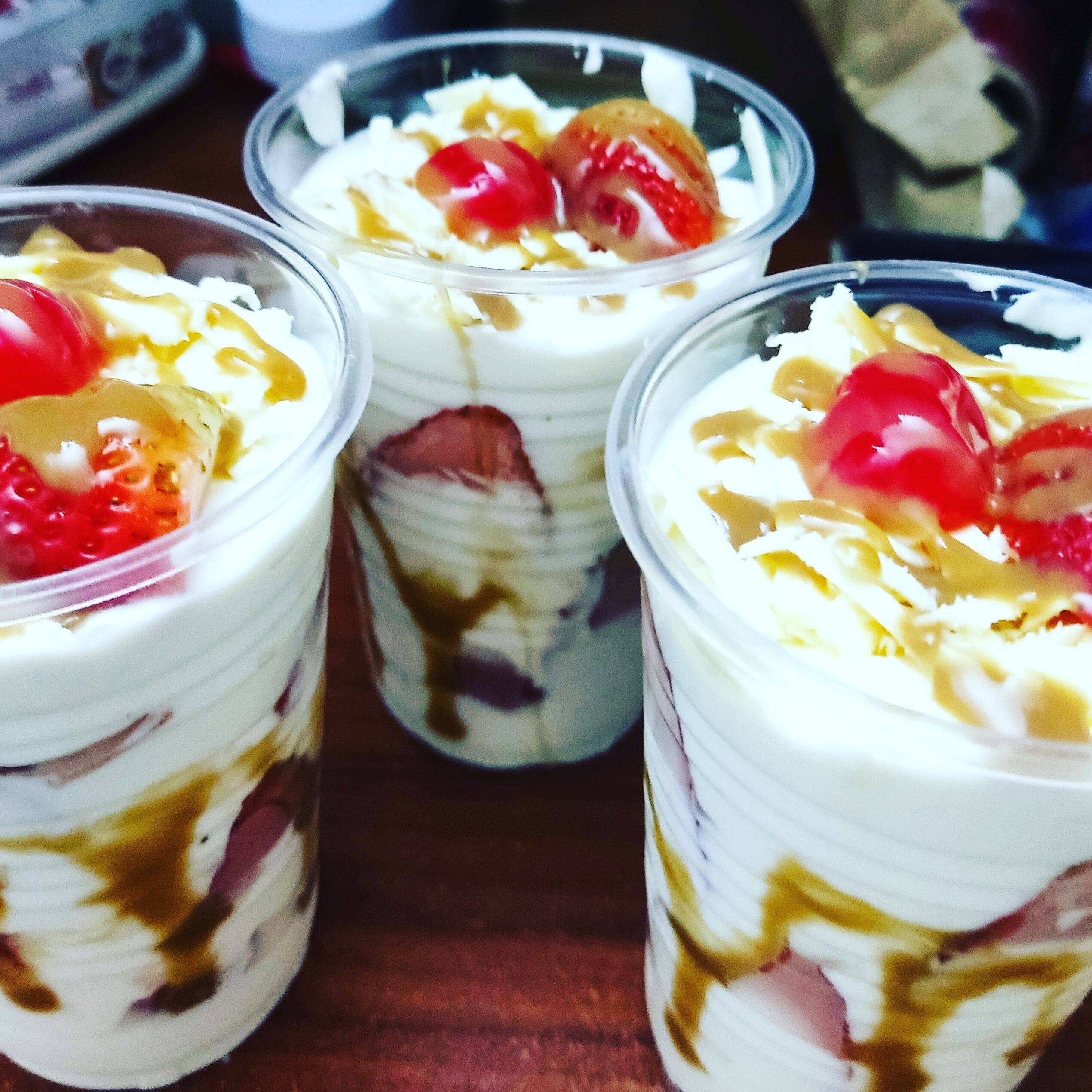 Crema, fresas, cereza, chantilly y barquillo
