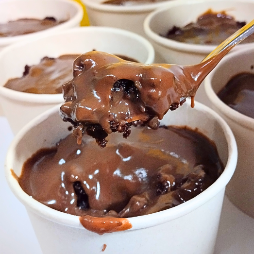 Torta húmeda de chocolate, bañado en almíbar de cacao con capas de fudge de milo. El fudge es la crema que acompaña la torta