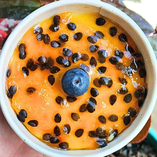 Frío y cremoso elaborado con una mezcla de cuatro leches, dónde la protagonista es la leche klim. Presentación cuchareable: capas de crema de leche klim, galletas que aportan ese toque ligeramente salado que equilibra lo dulce a la perfección y finaliza con un topping generoso de mermelada de maracuya artesanal y 1 arandano. "