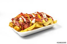 Papas, cerdo picado, chicharroncitos, Salchichas, queso costeño o mozzarella derretido sobre las papas y salsas . Se envian en dos cajas de J1.