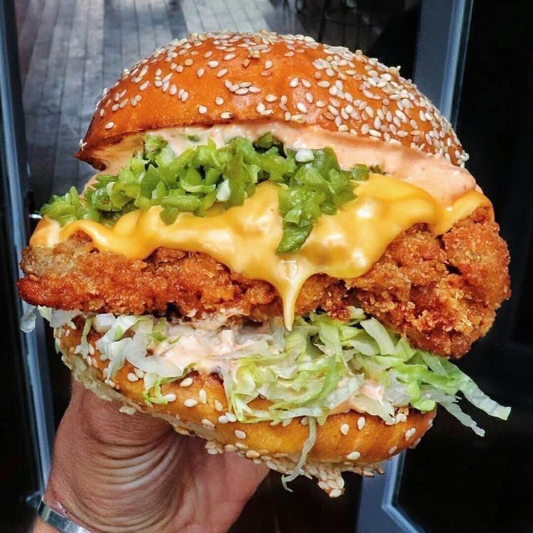 Hamburguesa con pan chicharrón un filete de pechuga de pollo apanado,, vegetales, salsa de la casa.