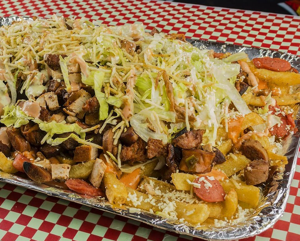 Papas, salchichas, cerdo picado, chicharroncitos, queso costeño o mozzarella derretido sobre las papas y Salsas a elegir. Se envia en una caja de J1.