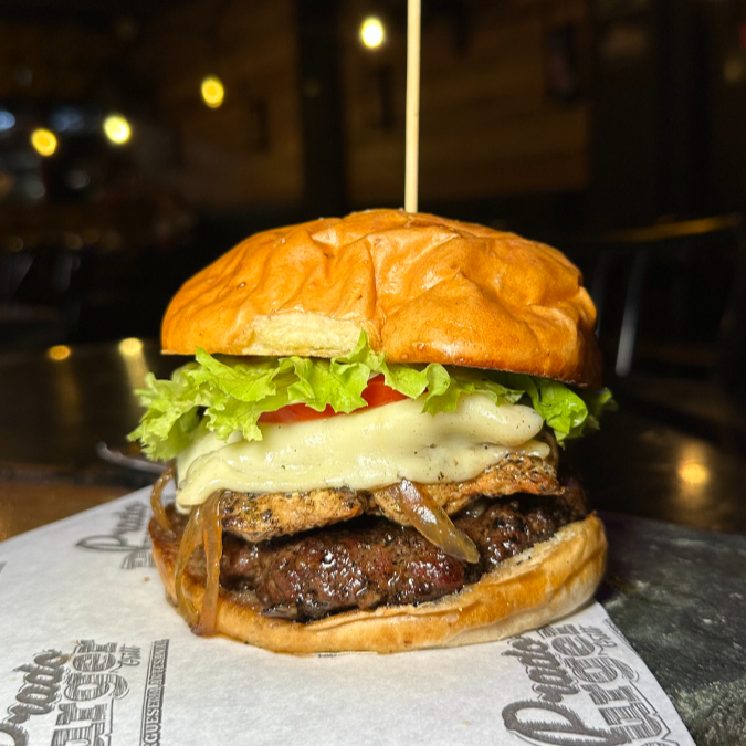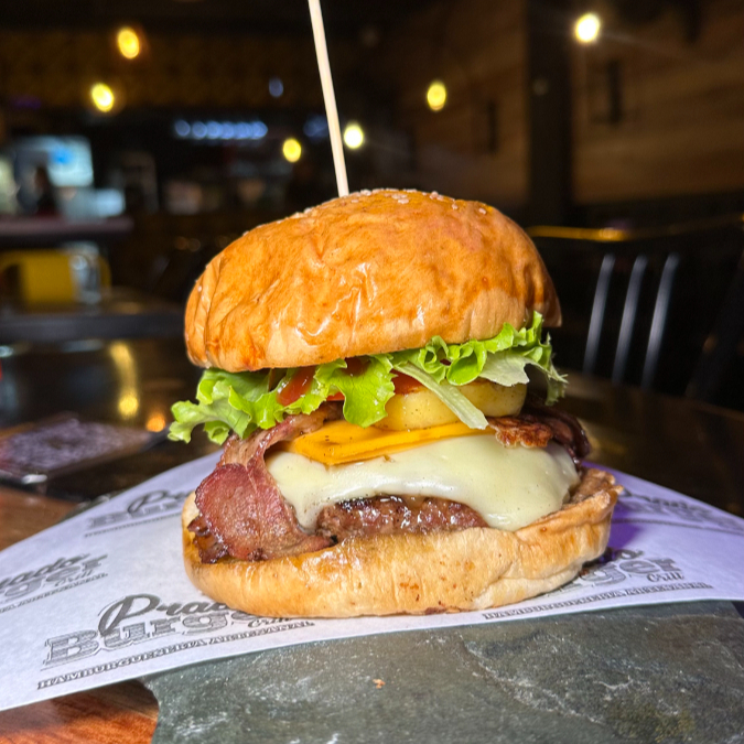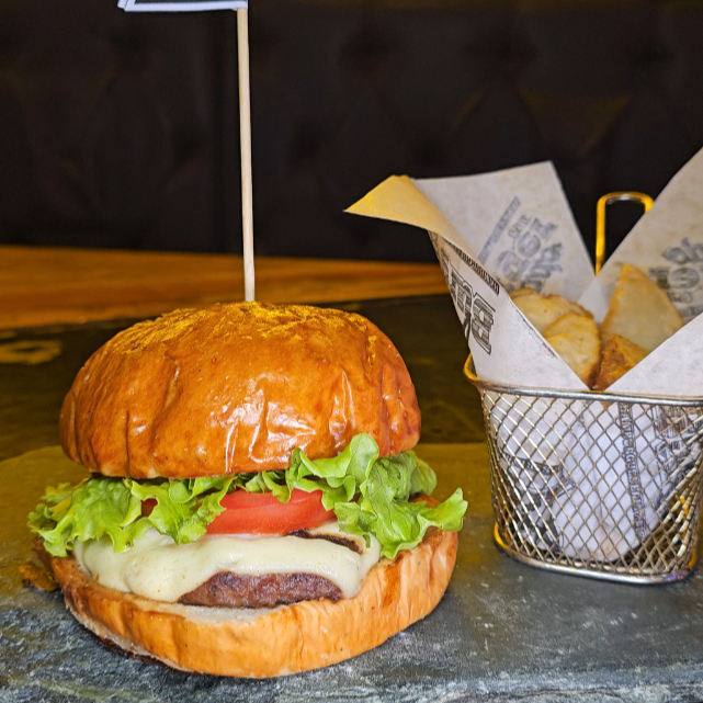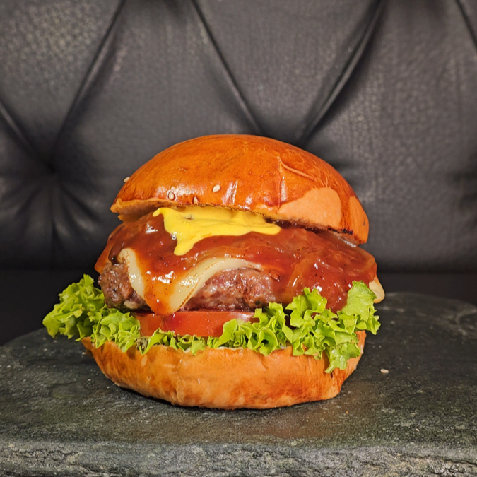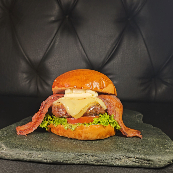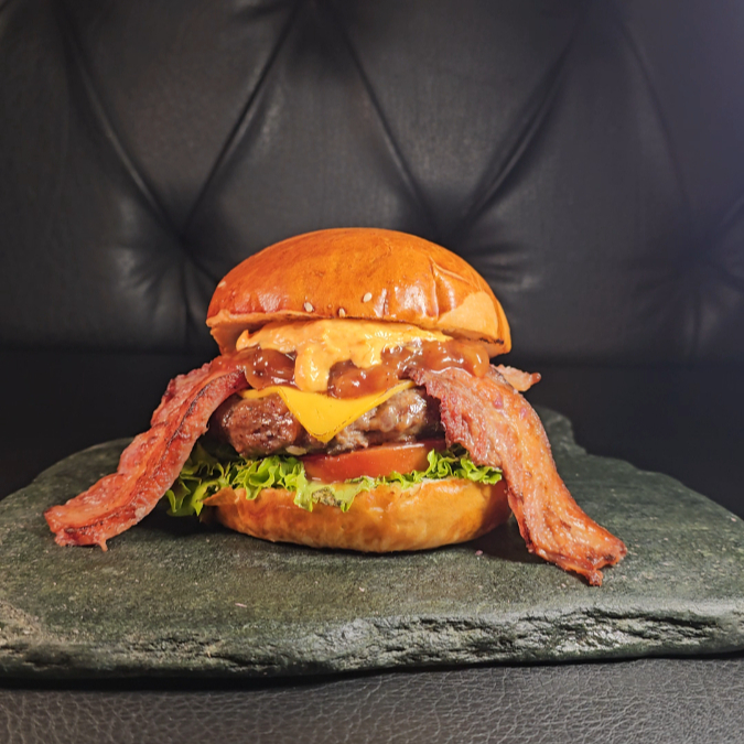 pan artesanal + 150g res + cheddar + cebolla confitada + tocineta glaseada en vino tinto + lechuga + tomate + dip de pimentón y bacon 🥓🍷+ Papas