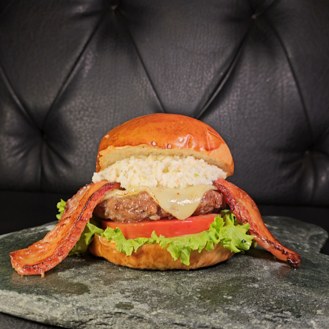 pan artesanal + carne de la casa en salsa Jack Daniel’s (con gotas de whisky) + queso Philadelphia + tocineta glaseada en vino tinto + vegetales frescos 🥃🧀
