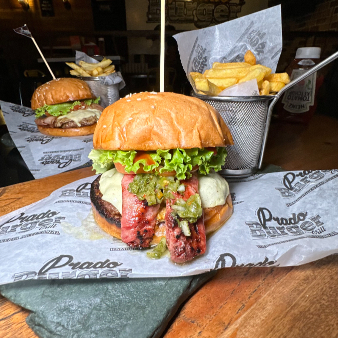 pan artesanal + carne de la casa + chorizo argentino + chimichurri + mozzarella + lechuga + tomate 🧄+ Papas