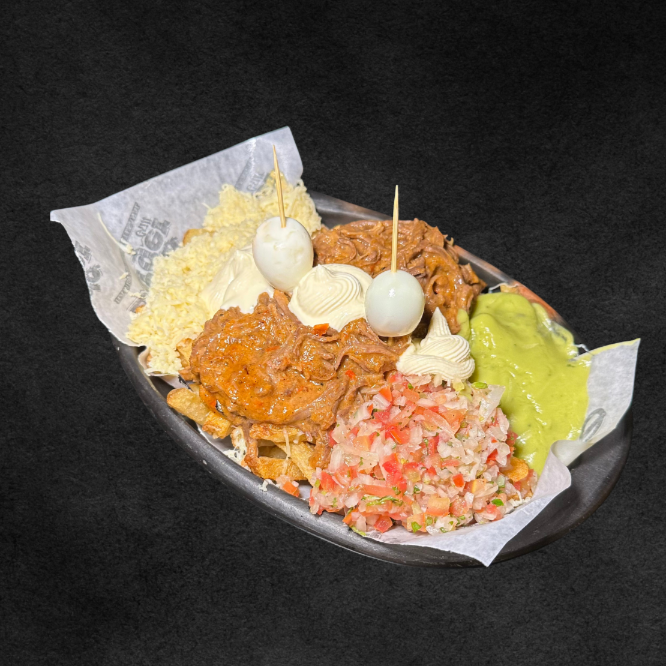 papas a la francesa + carne desmechada + huevitos de codorniz + pico de gallo + guacamole de la casa + queso rallado 🥑🌶️