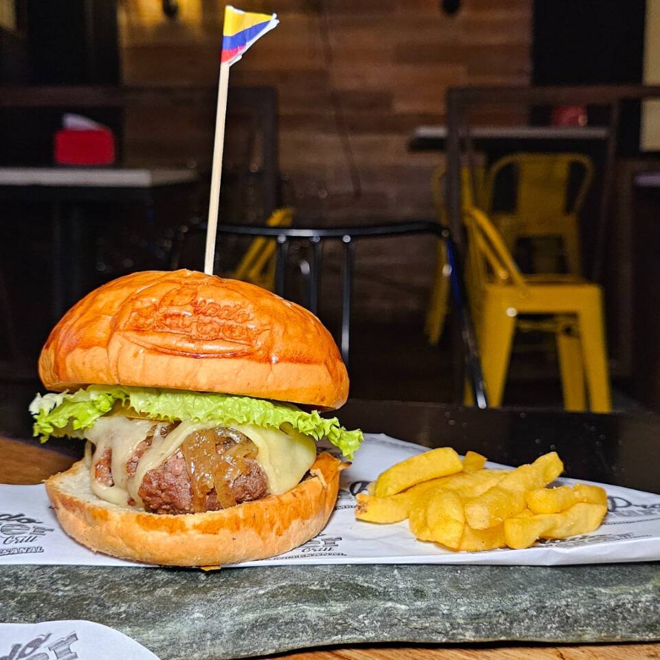 pan artesanal con mostaza dijon + carne de res con ajo y pimienta + salsa chipotle + cebolla caramelizada + mozzarella + lechuga + tomate 🌶️🔥+ Papas