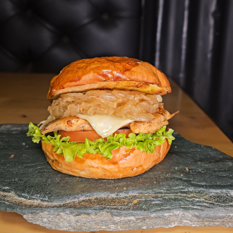 pan artesanal + pechuga a la parrilla + mozzarella + cebolla caramelizada + lechuga + tomate 🍗🥬+Papas