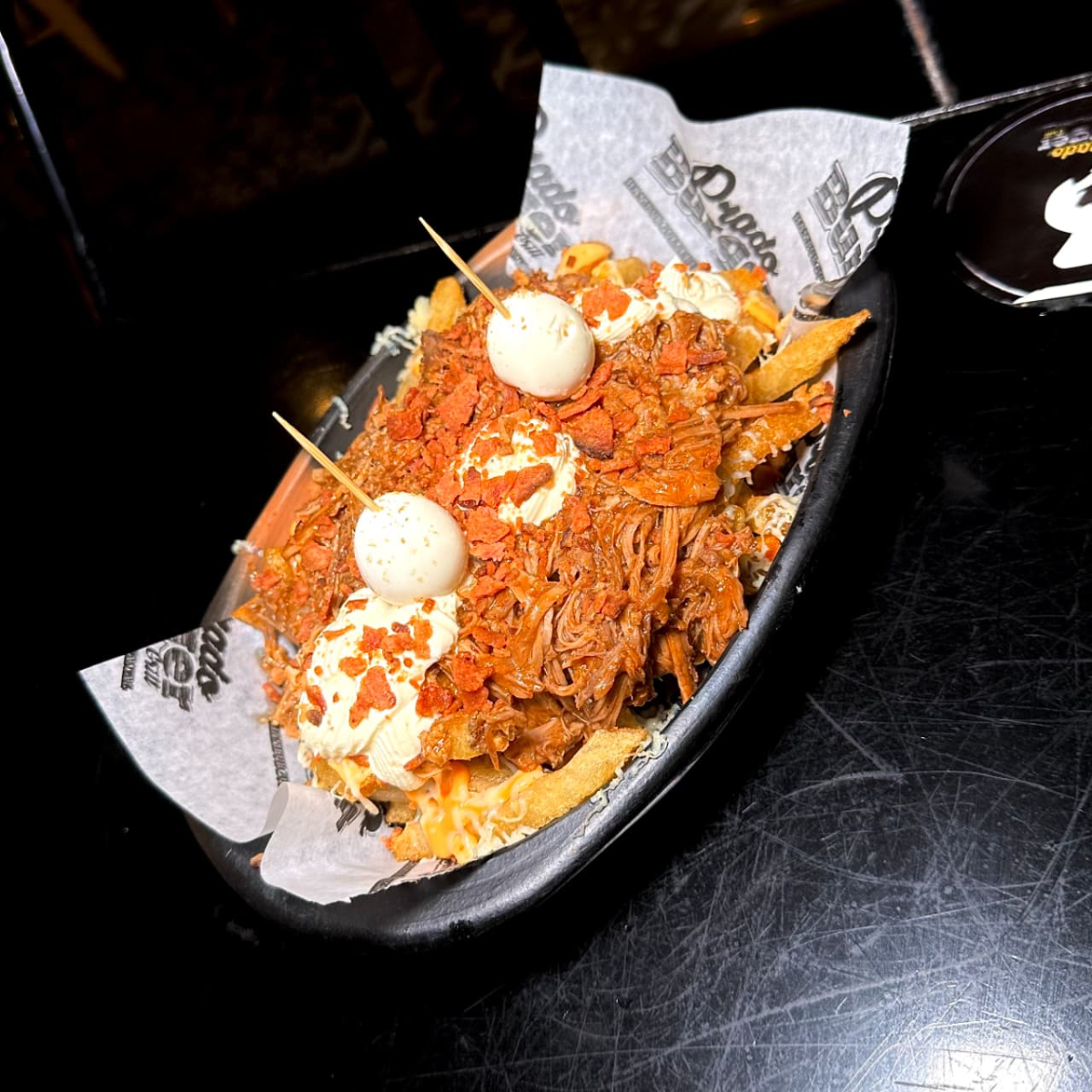 papas + queso derretido + pulled pork en BBQ + huevitos de codorniz + tocineta crujiente + salsa cheddar 🧀🥓