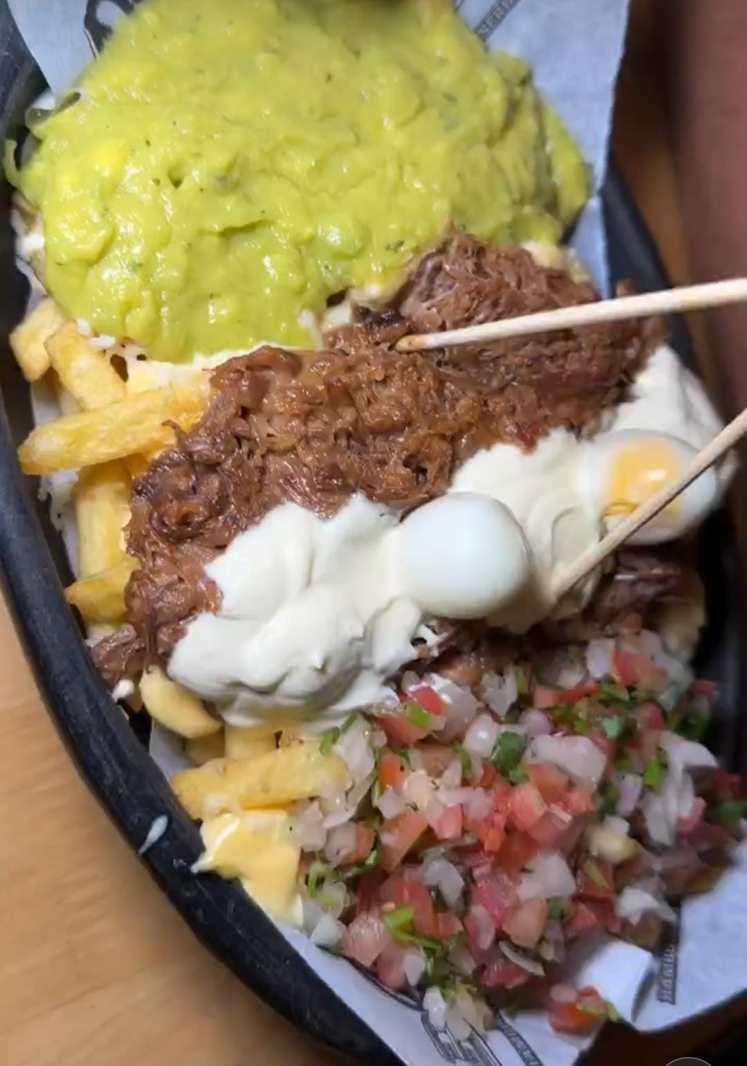 Doraditas papas a la francesas, compañadas de carne desmechada, huevos de codorniz, pico de gallo, guacamole, y queso rayado