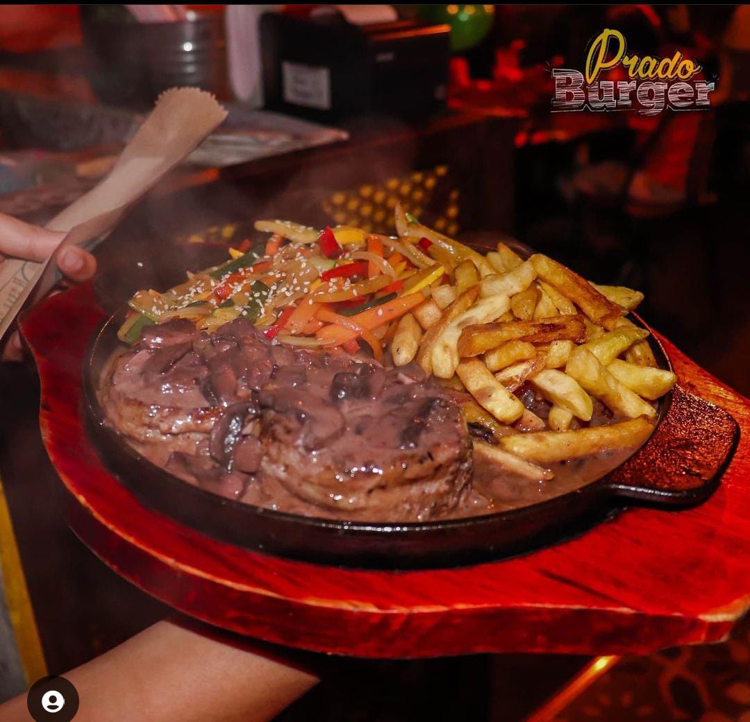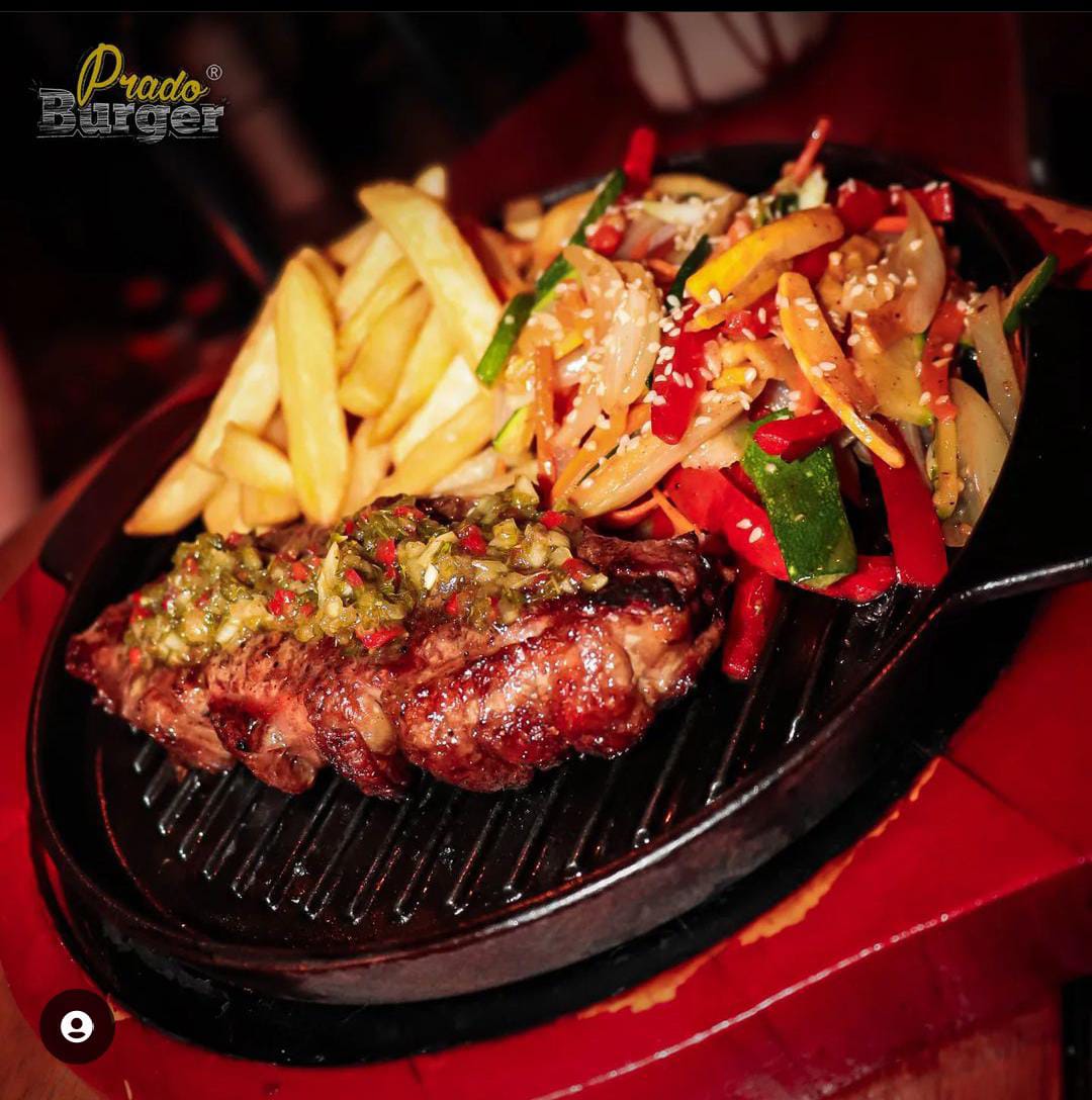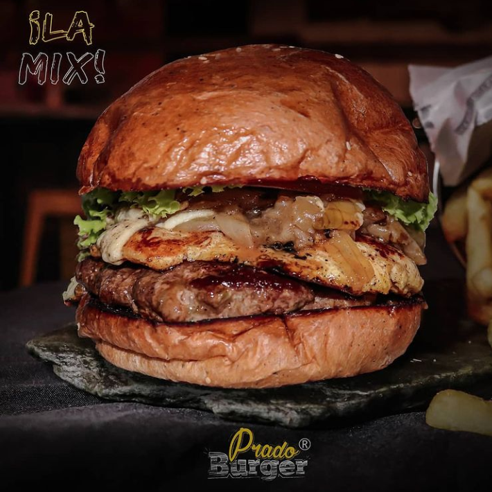 Deliciosa carne de res acompañada de un filete de pechuga de 125 gramos a la plancha, queso mozzarella, cebolla caramelizada, lechuga, tomate y salsas de la casa