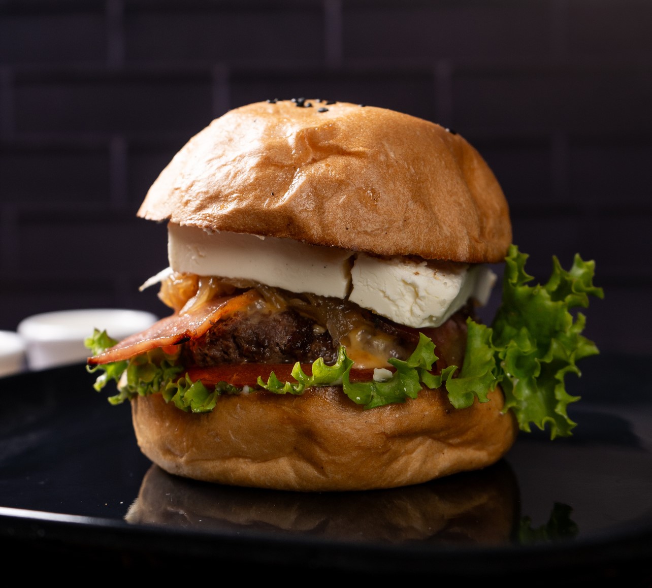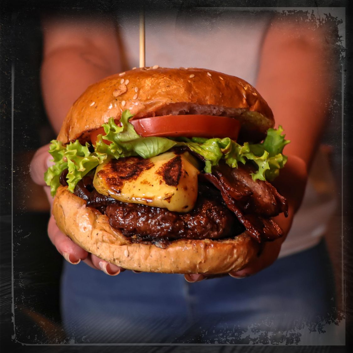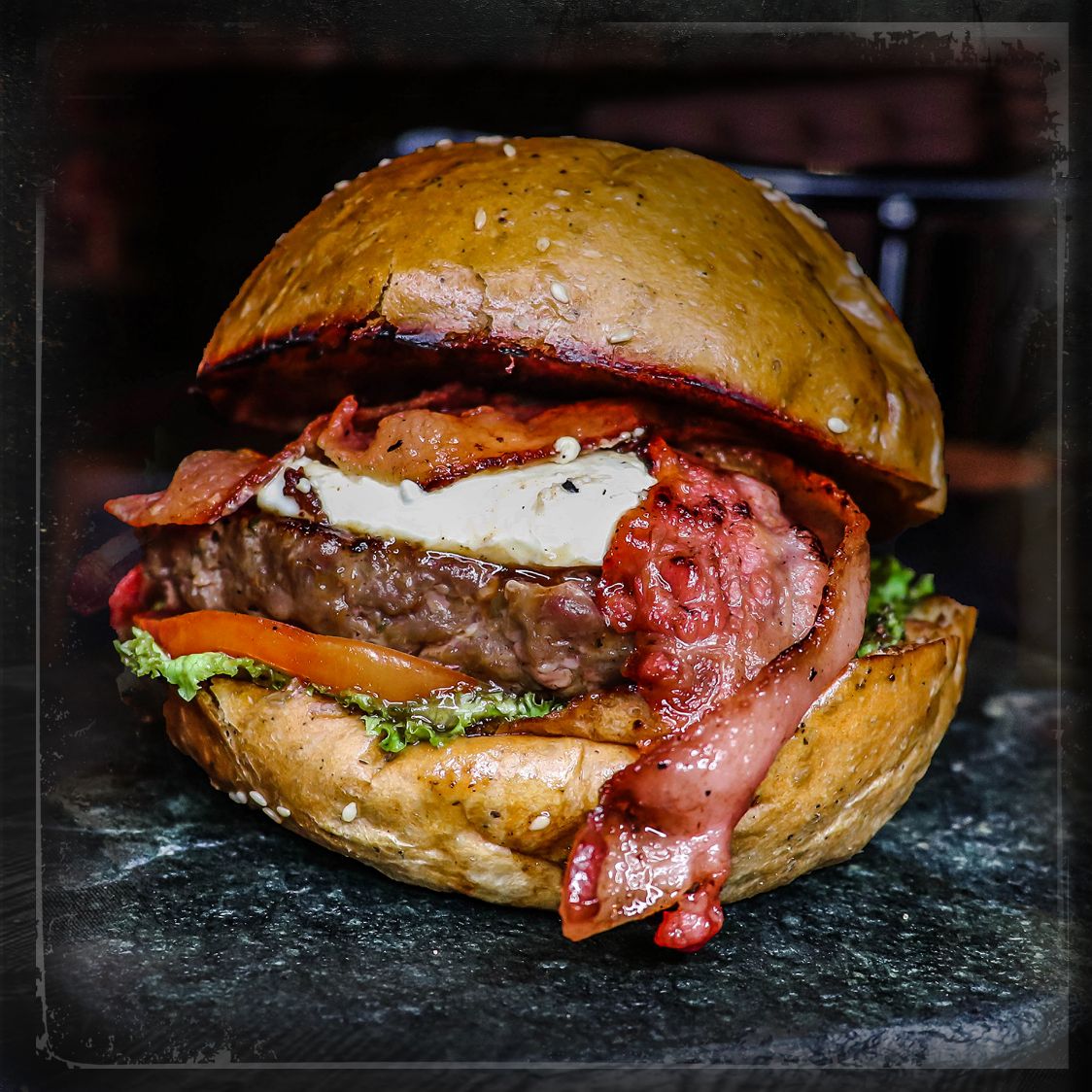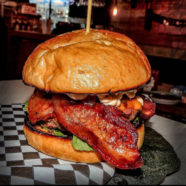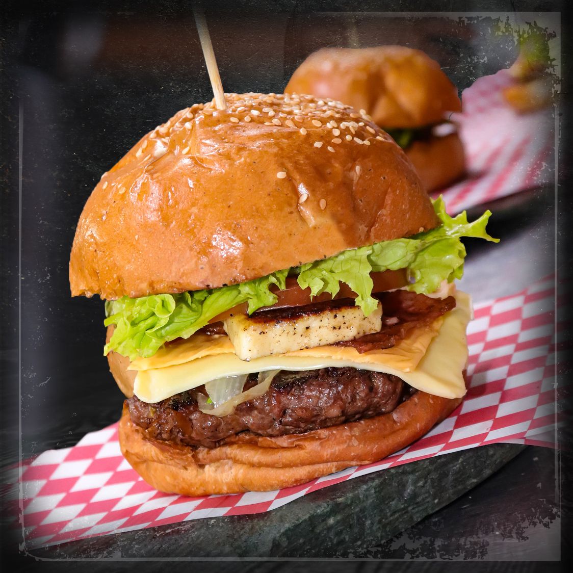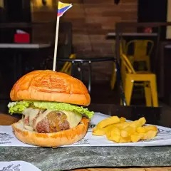 Carne de la casa, acompañada de lechuga, tomate, una combinación entre queso mozzarella, queso americano, queso papialpa, queso crema y queso azul, tocineta, cebolla caramelizada y pan fresco