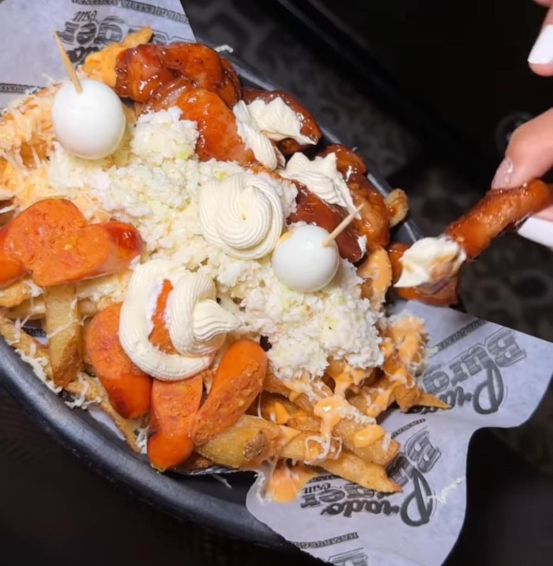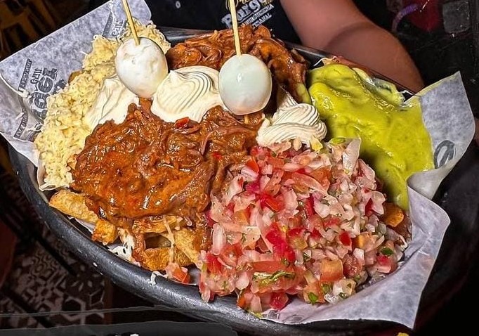 Crujientes papas con queso derretido, acompañadas de pulled pork bañado en salsa barbacoa, huevos de codorniz, tocineta crujiente, y salsa chedar