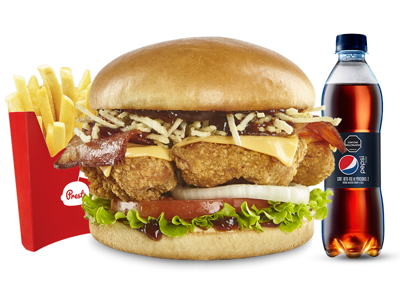 Hamburguesa de pollo crispy, acompañado con papa medianas y bebida pet 400 ml.