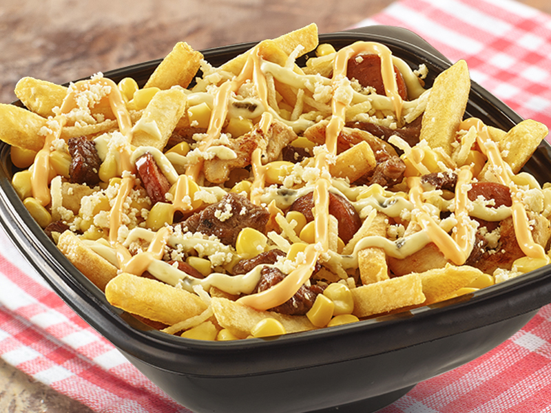 Mazorcada con trozos de pechuga de pollo, lomo, salchicha, maíz desgranado, queso mozzarella, papa francesa y papa fósforo, aderezo cheddar y salsa presto.