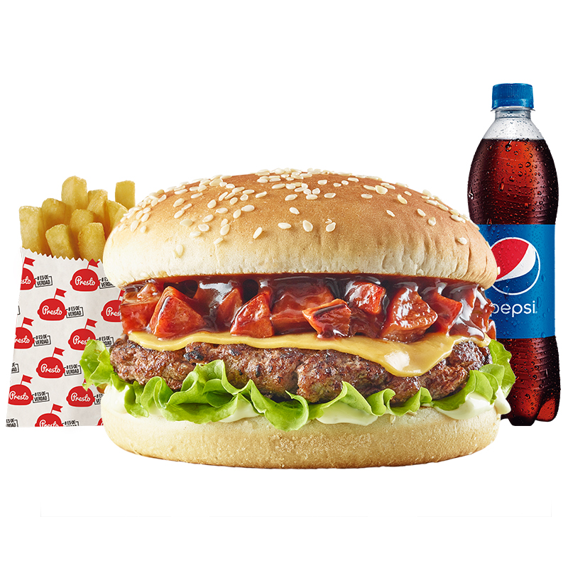 Hamburguesa con pan con ajonjolí, carne de res artesanal 104 gr, tajada cheddar, salchicha salteada en salsa BBQ, salsa Presto y lechuga, acompañada con papas pequeñas, 1 copa de salsa Presto y una bebida de 400 ml.