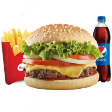 1 hamburguesa cheese burger + 113 gramos de papa francesa y 1 bebida 400 ml