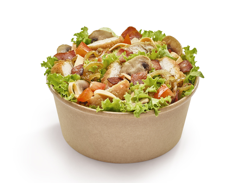 Con trozos de pollo apanado, lechuga crespa, cebolla grillé, champiñones salteados a la plancha, trozos de tomate, queso tipo cheddar, trocitos de tocineta y vinagreta francesa.