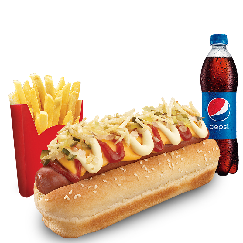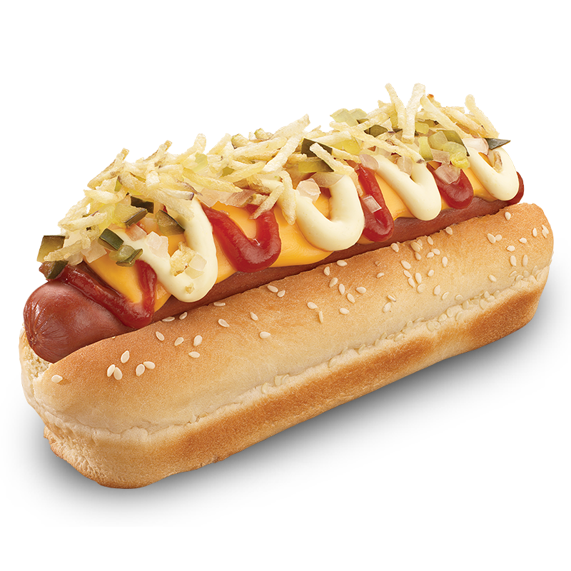 Pan con ajonjolí, salchicha, tajada cheddar, papa perro, pepinillo y cebolla finamente picados, salsa Presto y salsa de tomate.