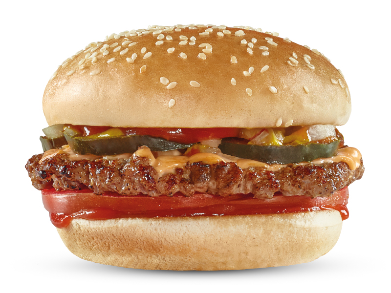 Hamburguesa con pan con ajonjolí, carne 100% res de 70gr, 6,5g de queso cheddar, salsa de tomate y mostaza, con los clásicos pepinillos, tomate y cuadritos de cebolla.