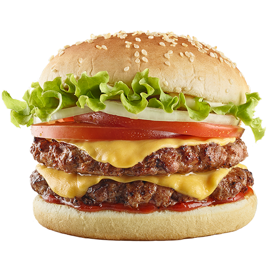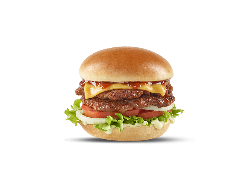Nueva receta de carne con doble carne de res de 52 g, pan tipo brioche, tajada de queso cheddar, tomate, cebolla y lechuga con salsa BBQ y salsa Presto.
