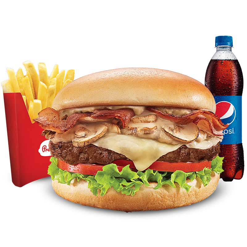 Hamburguesa con pan tipo brioche, carne artesanal de 104gr, queso mozzarella, salsa de champiñones, tocineta, lechuga y tomate., Papas medianas, 1 copa de salsa Presto y Gaseosa 400 ml.