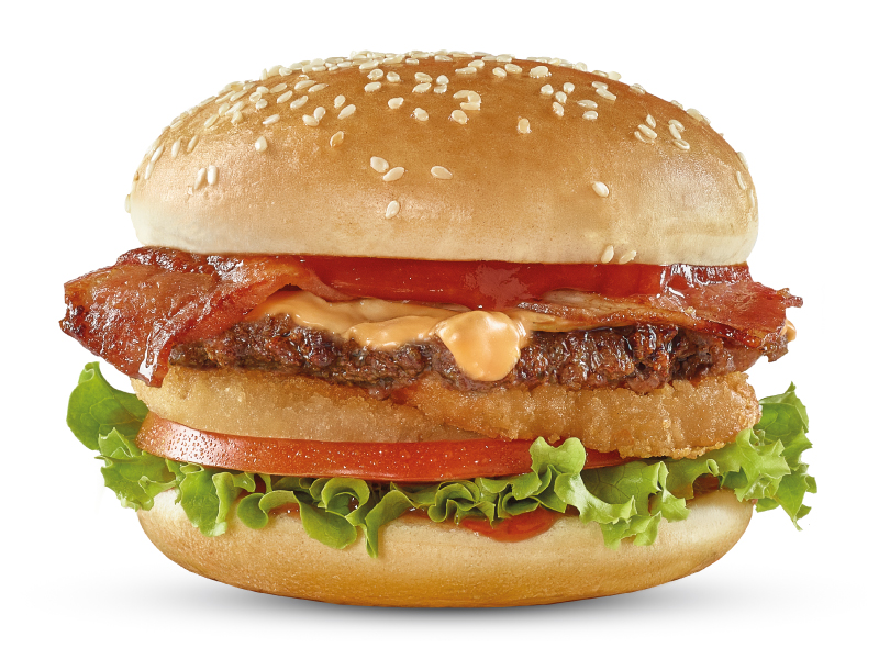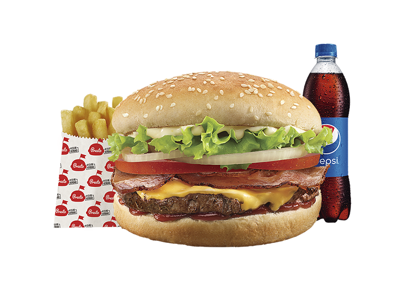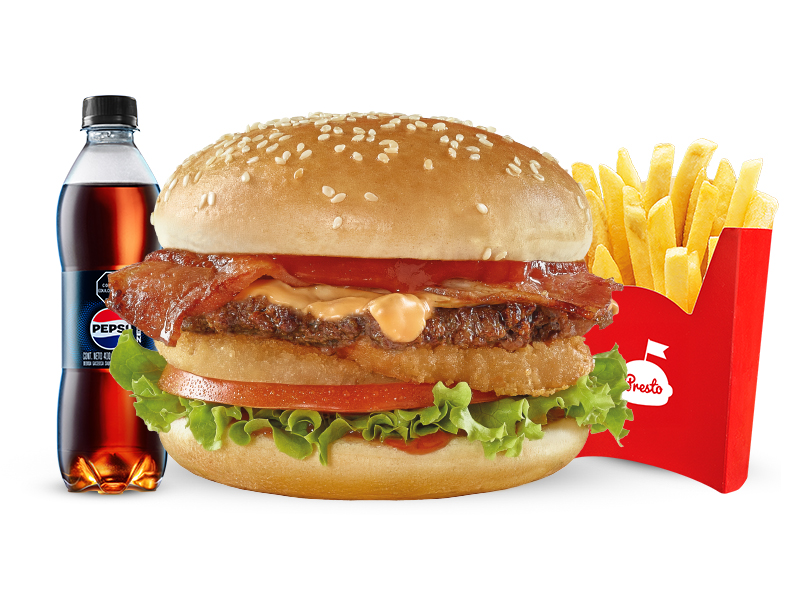 Hamburguesa con pan con ajonjolí, carne 100% res de 70gr, 6,5g de queso cheddar, crujientes anillos de cebolla, tocineta, lechuga, tomate y salsa de tomate. Acompañada con papas pequeñas, una copa de salsa Presto y bebida de 400ml.
