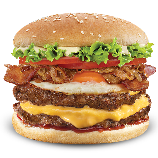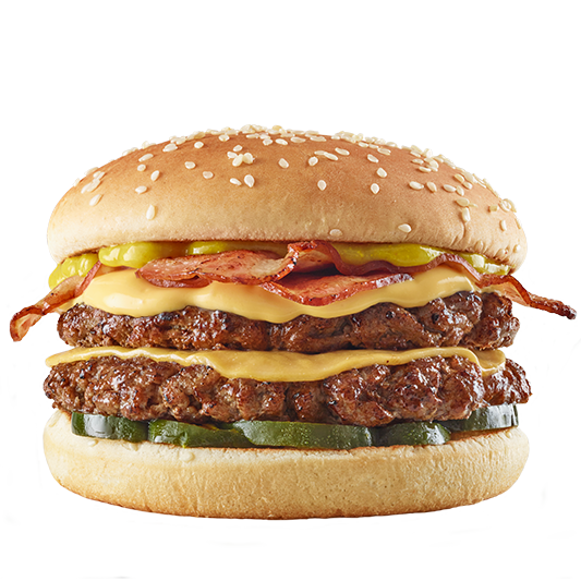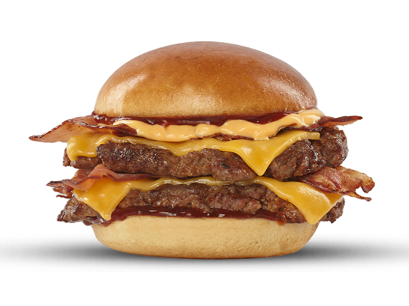 Doble carne artesanal de 104 g cada una con queso para asar derretido al punto perfecto, tres tiras de tocineta crujiente, cebolla grillé, tomate fresco y lechuga crocante, todo envuelto en nuestro pan artesanal y coronado con una deliciosa salsa BBQ dulce dulce.